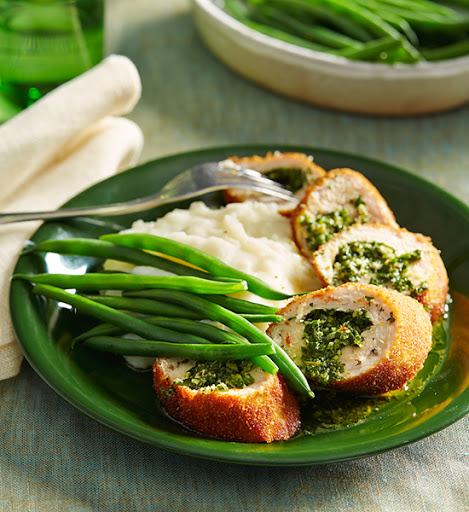 Preheat oven to 400 degrees F or 200°C. Roll parcels in flour, dip in egg, then coat with crumbs. Pour oil into a medium saucepan until 5cm deep and heat to 180°C. Deep-fry chicken for 3 minutes or until deep golden, then transfer to a wire rack set over an oven tray. Bake for 5-6 minutes or until cooked through. Serve with potatoes and green beans.