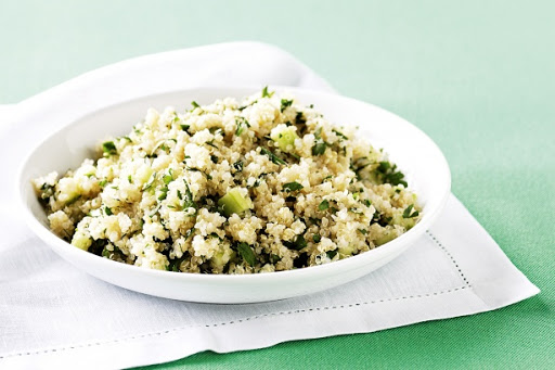 Place quinoa and 1 1/2 cups cold water in a saucepan over high heat. Cover. Bring to the boil. Reduce heat to low. Simmer for 10 to 12 minutes or until water has absorbed. Drain. Rinse. Transfer to a large bowl.