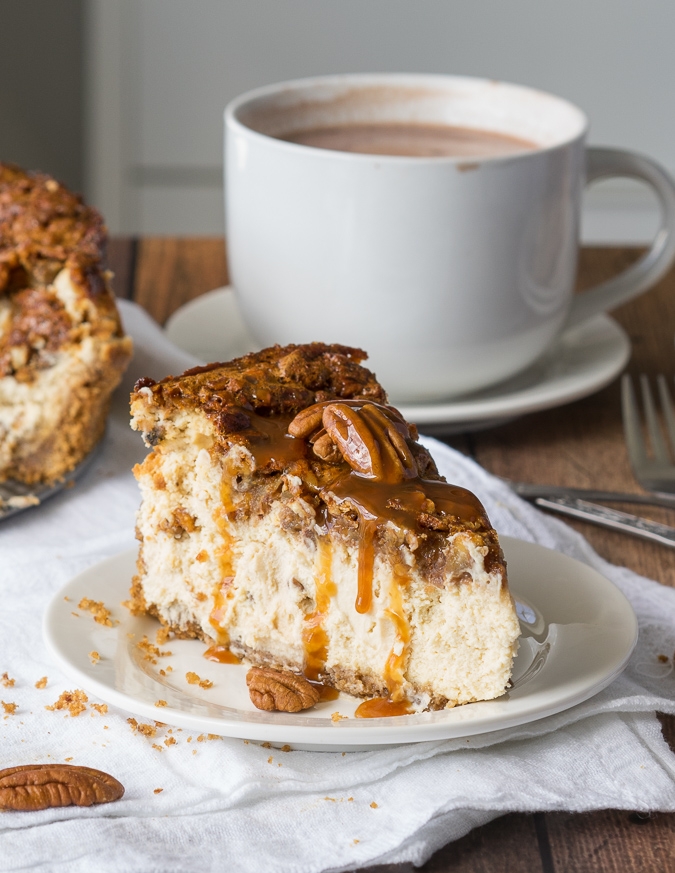 Sprinkle chopped pecans over the top of the cheesecake in an even layer. In a large bowl whisk the 3 eggs and then whisk in caramel. Pour over pecans on top of cake batter.