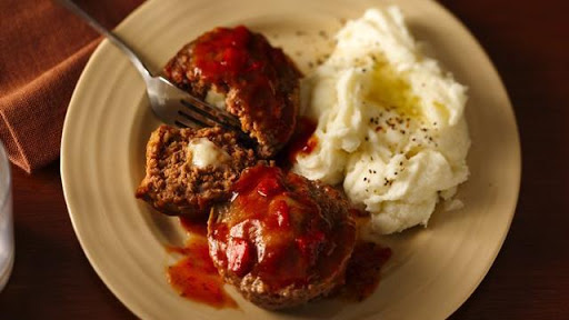Spray 12 regular-size muffin cups with cooking spray. Divide beef mixture evenly among cups (cups will be very full). Push 1 piece of cheese into center of each loaf. Place muffin pan on cookie sheet to catch any spillover. Bake about 30 minutes or until thermometer inserted in center of loaves in middle of muffin pan reads 160°F (outer loaves will be done sooner).