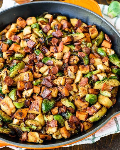 With sweet potatoes, apples, Brussels sprouts, and bacon, this one-pan chicken dinner is ready in less than 30 minutes. Perfect for a healthy fall dinner!
