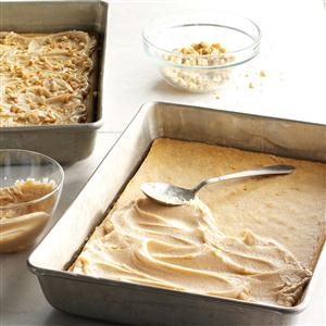 Transfer to prepared baking pan. Bake 20-25 minutes or until a toothpick inserted in center comes out clean. Meanwhile, for frosting, in a large bowl, beat peanut butter and butter until blended. Beat in confectioners’ sugar alternately with enough milk to reach spreading consistency.