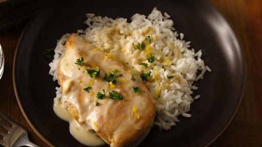 Pour sauce mixture over chicken. Reduce heat to medium-low; simmer 5 to 10 minutes or until juice of chicken is clear when center of thickest part is cut (at least 165°F). Sprinkle with parsley and lemon peel. Serve with rice.