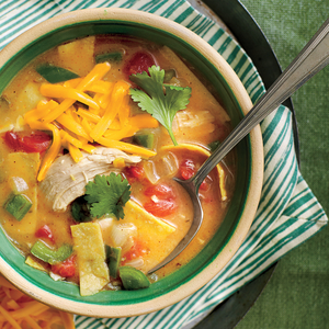 2. Increase heat to medium-high, and bring to a boil. Reduce heat to low, and simmer, stirring occasionally, 5 minutes. Stir in tortilla strips, and simmer 2 more minutes. Add salt to taste.