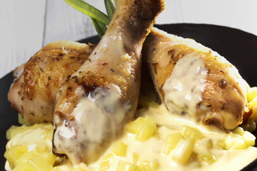 When potatoes are cooked through, remove from heat. Add butter and parmesan, then place chicken and Époisses sauce on top.