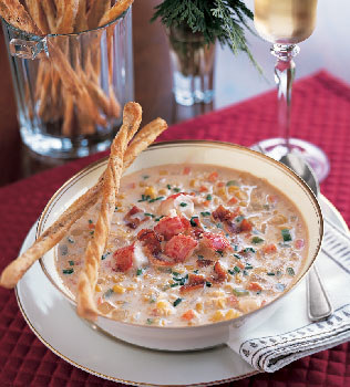 Melt butter in medium nonstick skillet over medium heat. Add lobster meat and sauté just until heated through, about 2 minutes. Ladle soup into bowls. Garnish each serving with lobster pieces, bacon, and chives and serve.