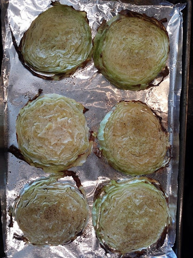 Cut cabbage into slices and place in a single layer onto a baking sheet lined with foil. Spray the cabbage slices with extra virgin olive oil. Sprinkle with garlic powder, onion powder, sea salt, and pepper. Roast in oven for 20 min at 450 degrees.