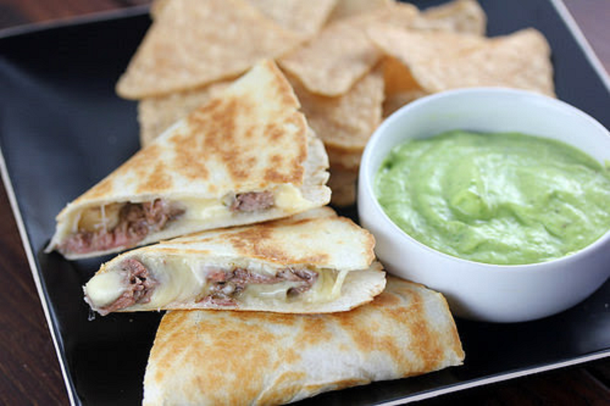 Once the cheese has melted and the tortilla has browned on the bottom, fold the half with just the cheese over the half of the tortilla with the steak and press gently with a spatula. Cut into 3 slices and serve with the avocado-lime sauce on the side. Repeat with the remaining tortillas.