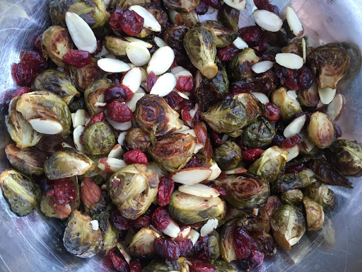 Take cookie sheet out of the oven and drizzle Brussels sprouts with honey and sprinkle with cranberries and almonds. Put back in the oven and bake for another 5 minutes — or until warmed through.