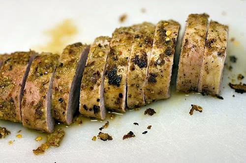 Grill or broil the pork, turning it with tall so that is browned on all sides and the meat feels springy when pressed, about 15 to 20 minutes, according to thickness. The pork should pink and juicy when cut, and a meat thermometer inserted into the center should read 150° to 155°. Do not over cook. transfer the pork to a cutting board cover it with foil. The temperature will continue to rise 5° to 10° as the meat rests.