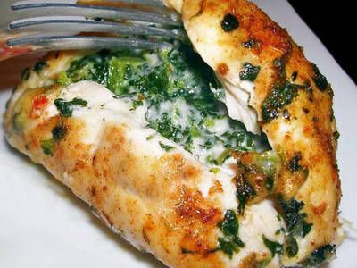 Spoon about 1/4 c of the spinach mixture onto each chicken breast.