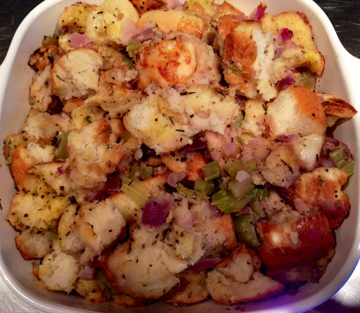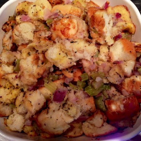I always substitute bagels for the bread in my dressing (sounds odd but it tastes delicious!) This dressing stuffed chicken is a perfect weekend supper, or make the stuffing as a side dish.