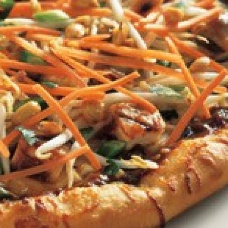 Distribute half the chicken pieces over the cheese followed by half the green onions, sprouts and carrots, respectively. Sprinkle an additional ¼ cup shredded mozzarella over the other toppings and top the pizza with 1 TBSP chopped roasted peanuts.