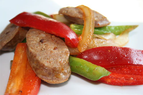 Using a slotted spoon, tranfer the sausage to paper towels to drain.Pour off all but 2 teaspoons of the drippings in the skillet. Add the onion, bell peppers, and the garlic. Cook, stirring occasionally, until the vegetables are softened, about 10 minutes.