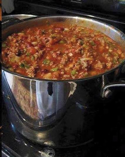 In a large skillet, brown the ground beef. Drain off the fat. Put the beef and the remaining ingredients in a 6-quart pot. Cover the pot and let the chili simmer for 1 to 1 1/2 hours, stirring every 15 minutes.