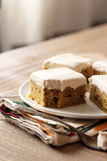In a large bowl, use an electric mixer to beat the butter and brown sugar on medium-high speed until light, fluffy, and smooth. Add in the cinnamon and salt. On low speed gradually add in the powered sugar until incorporated. Add in the vanilla and milk and increase the speed to medium-high. Beat until very light and fluffy. If too runny, add more powered sugar, If too thick, add more milk. Spread evenly all over the pumpkin bars.