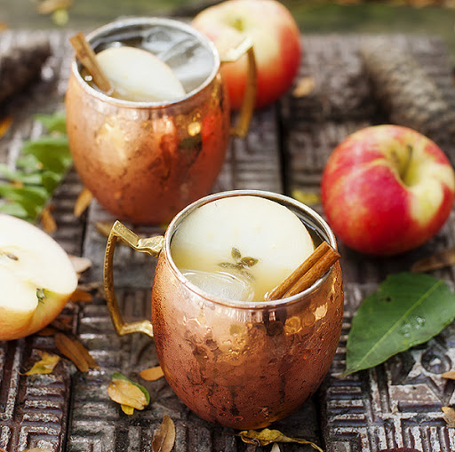 Fill copper mugs with ice (regular glasses will also work). Poor in vodka and apple cider. Top with ginger beer. Stir with cinnamon stick (or whatever you like to stir with) and garnish if you prefer. Cheers!