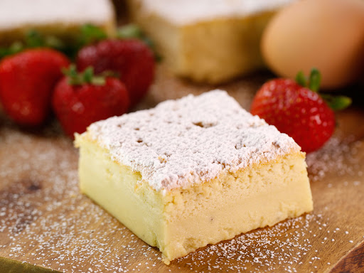 To serve, dust with powdered sugar, cut into squares and pair with fresh berries.