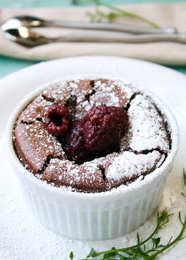 Gently scoop the cocoa-egg white mixture into the prepared dishes (or dish). Bake until the souffle rises above the rim and is set in the center 15-20 minutes for individual souffles or 40-45 minutes for large souffle. Using a fine mesh sieve, dust the top with confectioners' sugar. Serve immediately, garnished with the raspberries.