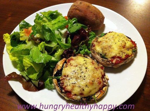 Hungry, healthy, happy! This has all the taste of a pizza, without the grease and all the calories.