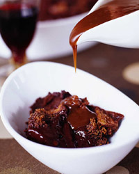 Pour the bread mixture into the prepared baking dish. Using a large spoon, dollop the chocolate ganache on top. Bake the bread pudding for about 35 minutes, or until it is cooked through. Let the chocolate bread pudding stand for 15 minutes, then serve with the Port Caramel Sauce on the side.