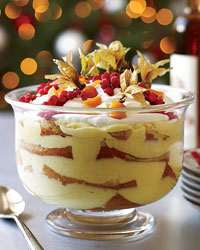 Run the blade of a paring knife along the sides of the cake and invert the cake onto a work surface. Peel off the parchment paper. Cut the cake into 3-inch squares. Reserve any scraps to patch holes. In a large glass trifle bowl, arrange a layer of cake squares. Using a pastry brush, soak the cake with some of the marsala syrup. Top with a 1-inch layer of the pastry cream. Repeat with the remaining cake, syrup and pastry cream, ending with a layer of cake and syrup. Cover the trifle loosely with plastic wrap and refrigerate for at least 3 hours or overnight. Top the trifle with the whipped cream and berries and serve.