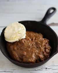 Bake the pudding in the middle of the oven for 20 minutes. Remove from the oven and stir well. Return the pudding to the oven and continue cooking for 20 minutes. The pudding will still be quite wobbly but will set as it cools. Let cool on a rack for 20 minutes and serve warm. Or cool completely and reheat the pudding in a 350° oven for about 5 minutes just before serving. Serve the pudding topped with the ice cream.