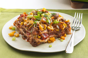 BROWN meat with onions and peppers in large skillet on medium-high heat. Stir in chili powder; cook 1 min. Add salsa and corn; mix well. Simmer 5 min.