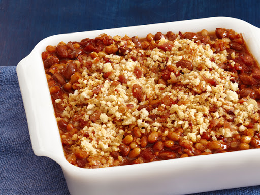 Pulse the buns with the remaining uncooked bacon in a food processor until finely ground. Sprinkle the crumbs evenly over the bean mixture. Cover and bake 45 minutes, then uncover and bake until the crumbs are golden brown, about 20 more minutes.