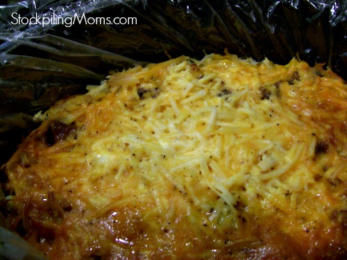 Layer frozen potatoes, bacon or sausage, onions (if using), green pepper (if using) and 1 cup shredded cheese in the crock pot in two or three layers. (here is where I would add the soup mixed with the sour cream. And I would stir the mixture in with the potatoes.