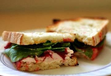 Toast 2 slices of bread. Spread mustard on one slice, mayo on the other. To the slice with mustard, add the turkey breast, then the cranberry sauce, then the arugula leaves. Top with the other slice of bread. Cut in half.