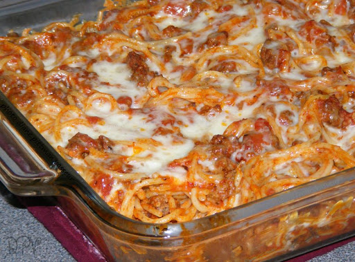 Remove the sauce from the heat. Spoon a little of it in the bottom of a 13x9 baking dish, just enough to coat bottom. Add the pasta to the remaining sauce, tossing to coat. Lightly spoon the mixture into the casserole dish (do not pack it down). Sprinkle top with the shredded cheese.
