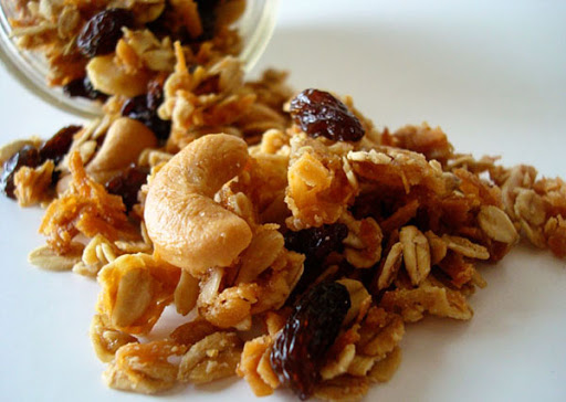 Preheat oven to 250 degrees. In a large bowl, combine the oats, nuts, coconut and brown sugar.