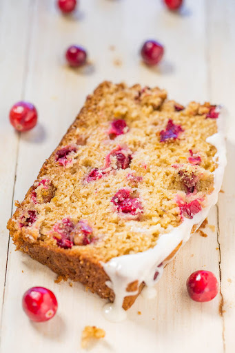 Bake for about 70 minutes and tent pan with a sheet of foil at the 30-minute mark by loosely draping a sheet of foil over the top and sides of pan. This prevents top and sides of bread from becoming overly browned before the center cooks through. Bread is done when the top is set in the center, domed, springy to the touch, and a toothpick inserted in the center (if you can find a patch without hitting cranberries) comes out clean or with a few moist crumbs, but no batter. Baking times will vary based on oven and climate variances, how moist the cranberries are, etc. Bake until your bread is done in your oven. Allow bread to cool in pan for about 20 minutes before turning out on a wire rack to cool completely before glazing.