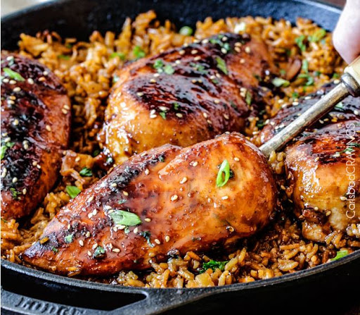 6.Brush chicken with additional Teriyaki Glaze and season rice with freshly cracked salt and pepper. Add sriracha for some heat if desired.