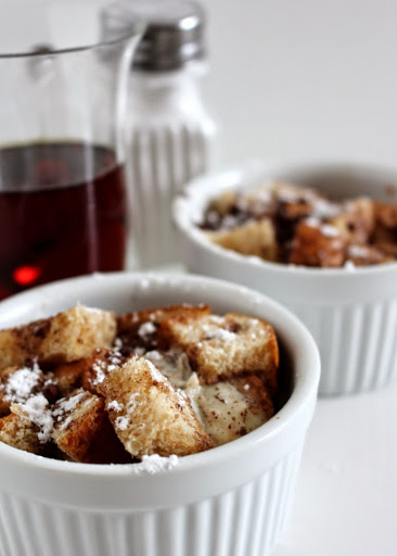 Spray 2 ramekins or coffee mug with nonstick spray. Divide buttered, cubed bread equally into the 2 mugs (one slice per mug).