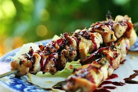 Plate the skewers and spoon the sauce over the chicken. Serve immediately.