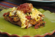 Wipe out the pan with paper towels, return to medium heat and add a few tablespoons of olive oil. Season the eggs with salt and pepper and add to the pan. Slowly cook, stirring until soft curds form. Remove from the heat and fold in the parsley. Place 2 slices of the ham on each slice of bread. Top with some of the eggs and then some of the pepper mixture. Serve on a large platter.
