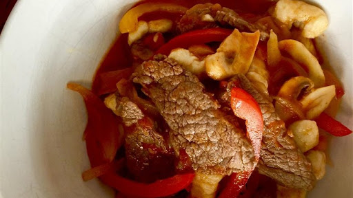 Reduce heat to medium, then stir in the onion and garlic, and cook until transparent, about 5 minutes. Toss in the mushrooms, red peppers, and yellow peppers and cook until tender, another 5 minutes. Stir in the tomatoes and paprika; bring to a boil over medium-high heat. Reduce heat to low and simmer until sauce thickens, about 5 minutes. Combine the beef with the tomato mixture and stir.