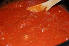 This sauce is made in bulk quantities and then used for lasagnas, manicotti, ravioli and can be frozen for spaghetti or pizzas. When defrosting it is OK and quite normal to pour off extra liquid.