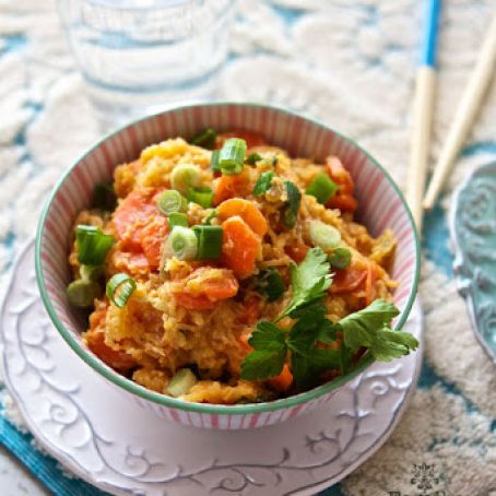 In a large non stick skillet add the oil, garlic and carrots. Heat over medium high heat a few minutes until the carrots soften. Add the chopped spaghetti squash into the pan and cook for about 5 minutes. Quickly stir in the eggs with a rubber spatula and combine well. They will scramble into the squash. Add fish sauce, some Sriracha and 1/4 cup green onion. Combine well. Serve topped with more green onion.