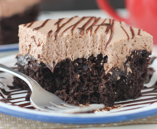 A rich Hot Chocolate Poke Cake with hot fudge and hot chocolate whipped cream. Yum!