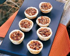 2. For topping, stir chopped pecans with melted butter until coated; stir in 2 tbsp (25 mL) sugar. Set aside. For pastry shells, use 2 nonstick mini-muffin pans with 12 cups each (if pans are not nonstick, coat cups with baking spray). Roll out pastry on floured pastry cloth until thinner than usual for pie crust, about 1/8-inch (3-mm) thick. Use a 2½-inch (6-cm) cookie cutter (or upturned glass) to cut into rounds. Press into cups, forcing dough slightly above cup edge. Use scraps to fill in any breaks or thin parts. Freeze 10 minutes.