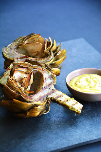 4. Serve grilled artichokes with rosemary mustard aioli.
