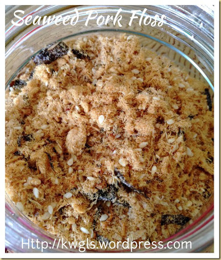 Transfer the broken meats to a non stick pan (alternatively normal frying pan with some oil). Stir fry under medium heat until the meat floss dries up. It took me the most is 15 minutes to get this done. Colour will gradually change and the stir frying will get easier and easier. Take some meat floss out and taste if this suit your taste buds. Otherwise, add seasonings of your choice (fish sauce, additional sugar etc.) Add the seaweed stripes and sesame seeds. Stir fry until well mixed and the seaweed stripes become crispy. Off heat and let it cool completely before store in an air tight container.
