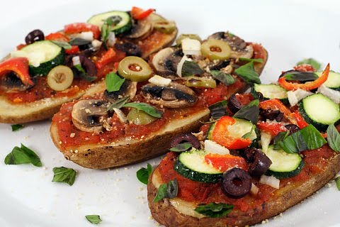 When the potatoes are done, take them out of the oven, spread each one with sauce, and top with your choice of toppings. (I made one with zucchini-calamata olives-red bell pepper, another with mushrooms-green olives-onions, and another with everything.) Put them back into the oven and bake for 15-20 more minutes, until the toppings are done to your taste.