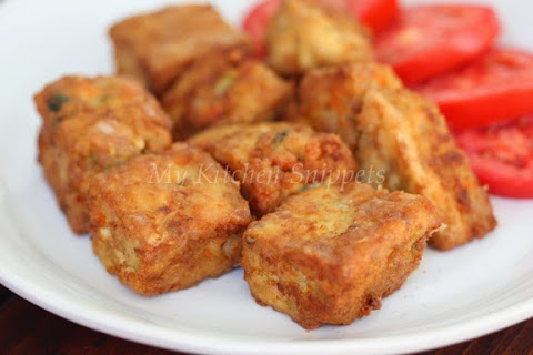 5. Cut it into 1 ½” or 2” squares. Heat up some vegetable oil for deep frying. Lightly dust the squares with cornstarch and deep fried them until golden brown. Serve warm with some chili sauce.