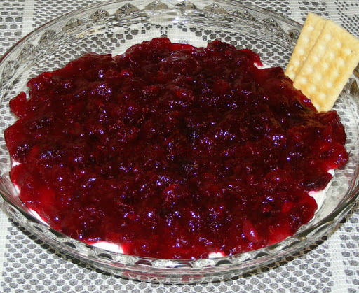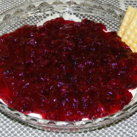 Cream cheese is spread in a pie plate and topped with homemade cranberry sauce and served with honey graham crackers or Club buttery crackers.