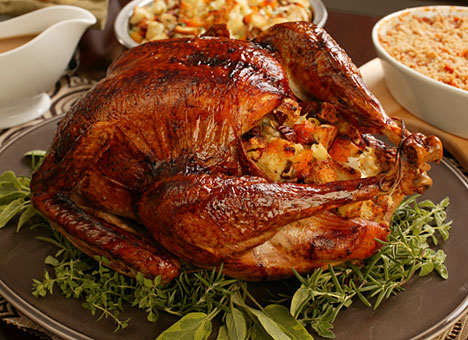 Opinions vary on whether or not to stuff the bird—some people think it can cause uneven cooking. For more on the subject, see our turkey primer. If you prefer not to stuff your bird, fill the cavities with a chopped vegetable and herb mixture that will impart its flavor to the meat and pan juices: Chop 1 onion, 1 celery rib with leaves, 1 carrot, and 3 tablespoons fresh parsley. Mix this with 1 teaspoon each dried rosemary, sage, and thyme. Sprinkle the cavities with salt and freshly ground black pepper and place the mixture inside. An unstuffed bird will take about 15 minutes to a half hour less to cook than a stuffed bird. When the turkey is cooked, tilt it to allow any juices that have collected in the cavity to drain into the pan. Do not serve the vegetable mixture, as it may not have cooked to a safe temperature.