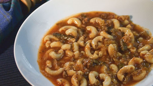 Stir in the macaroni, cover, and simmer over low heat until the pasta is tender, about 25 minutes, stirring occasionally. Remove from heat, discard bay leaves, and serve.